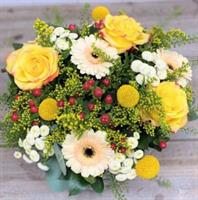 Bouquet rond de fleurs de saison, en bulle d’eau - Petite Taille S : Diamètre 35 cm - Tonalité au choix : Blanc/Vert ou Blanc/Parme ou Rose/Fuchsia ou Pastel ou Coloré.