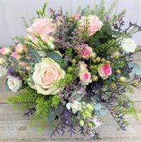 Bouquet rond de fleurs de saison, en bulle d’eau - Taille L : Diamètre 55 cm - Tonalité à choisir : Blanc/Vert ou Blanc/Parme ou Rose/Fuchsia ou Pastel ou Coloré -