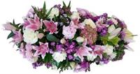 Raquette de fleurs de saison agrémentée d'un généreux feuillage, de forme allongée pour un dessus de cercueil - Taille L : 120 / 150 cm - Ruban inclus avec 50 caractères max - Tonalité au choix : Blanc/Vert ou Blanc/Parme ou Rose/Fuchsia ou Pastel ou Coloré -