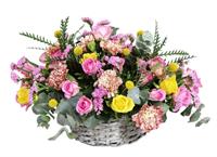 Composition de fleurs de saison ronde piquées en mousse dans une corbeille en osier - Taille L , diamètre env. 60 cm - Ruban inclus avec 50 caractères max - Tonalité au choix : Blanc/Vert ou Blanc/Parme ou Rose/Fuchsia ou Pastel ou Coloré -