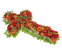 Majestueuse croix à base de fleurs de saison sur base de feuillage - Env. 75 x 50 cm - Ruban inclus avec 50 caractères max - Tonalité au choix : Blanc/Vert ou Blanc/Parme ou Rose/Fuchsia ou Pastel ou Coloré -