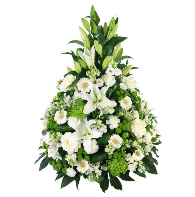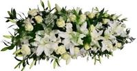 Photo non contractuelle | Desssus de cercueil blanc Dessus de cercueil avec fleurs de saison dans les tons blancs et agrémentée d'un généreux feuillage - Env. 150 cm - Ruban inclus avec 50 caractères max -