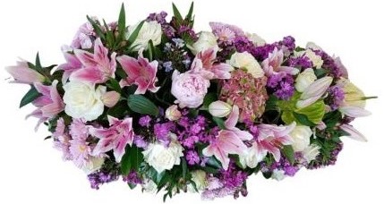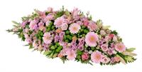 Photo non contractuelle | Desssus de cercueil pastel Délicat dessus de cercueil avec fleurs de saison pastel - Env. 150 cm - Ruban inclus avec 50 caractères max -