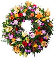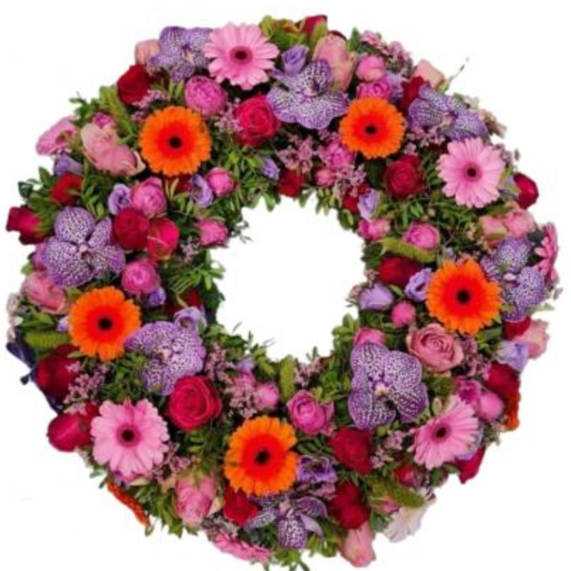 Photo non contractuelle | Couronne colorée Eclatante couronne de fleurs de saison colorées - Env. 60 cm - Ruban inclus avec 50 caractères max -