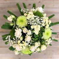 Photo non contractuelle | Bouquet blanc Bouquet rond de fleurs de saison dans les tons de blanc et vert, avec bulle d'au - Diamètre 30 cm