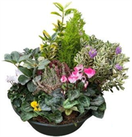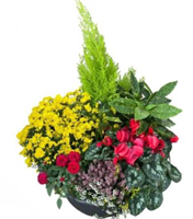 Photo non contractuelle | Composition fleurie / Moyen modèle Composition avec plantes et fleurs de saison, à base de 4 à 5 plantes vertes et fleuries - Diamètre env. 40 cm - Convient pour les cimetières