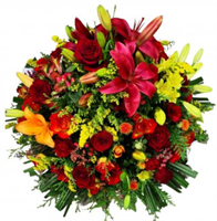 Photo non contractuelle | Gerbe Colorée Eclatante raquette de fleurs de saison colorées - Env. 70 / 75 cm - Ruban inclus avec 50 caractères max -