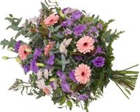 Photo non contractuelle | Gerbe pastel Gerbe pastel de style champêtre à base de fleurs saison dans les tons de rose et parme sur lit de feuillage - Env. 60 / 65 cm
