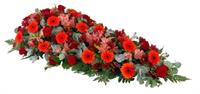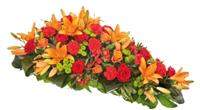 Photo non contractuelle | Desssus de cercueil coloré Eclatant dessus de cercueil avec fleurs de saison colorées - Env. 150 cm - Ruban inclus avec 50 caractères max -