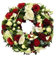 Photo non contractuelle | Couronne blanche et rouge Elégante couronne de fleurs de saison dans les tons de blanc et de rouge avec généreux feuillage - Env. 60 cm - Ruban inclus avec 50 caractères max -