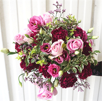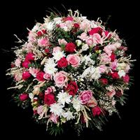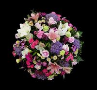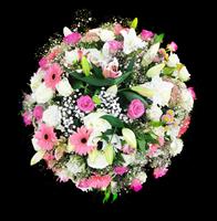 Photo for illustration purposes only | Bouquet rond de tonalité rose Bouquet rond de tonalité rose composé de fleurs de saison avec feuillage - Diamètre 40 cm