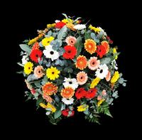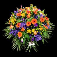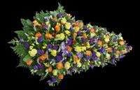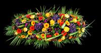 Photo for illustration purposes only | Dessus de cercueil coloré Dessus de cercueil de fleurs de saison colorées, tonalités jaune, orange et violet - Longueur 120 cm
