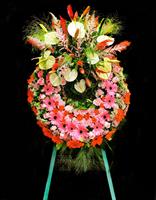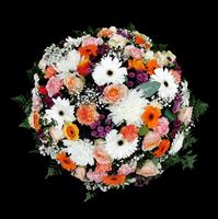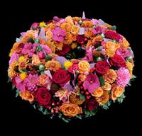 Photo for illustration purposes only | Couronne colorée Couronne colorée de fleurs de saison, tonalités orange, rose et rouge - Diamètre 60 cm