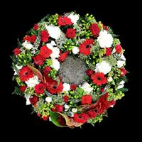 Photo for illustration purposes only | Couronne rouge et blanche Couronne de fleurs de saison rouges et blanches - Diamètre 60 cm