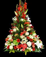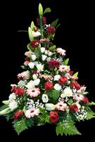 Photo for illustration purposes only | Coussin conique coloré Coussin conique coloré de fleurs de saison blanches et rouges sur base de feuillage - Hauteur 60 cm
