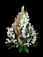 Photo for illustration purposes only | Coussin conique blanc Coussin conique graphique de fleurs de saison blanches sur base de feuillage - Hauteur 60 cm