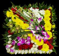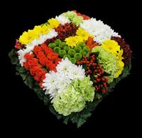 Photo for illustration purposes only | Coussin carré coloré jaune, rouge avec feuillage Coussin carré de fleurs de saison multicolores (jaune, rouge, blanc) et feuillage - Env. 50 cm