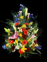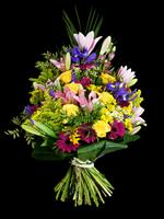 Photo for illustration purposes only | Gerbe colorée Gerbe colorée de fleurs de saison avec feuillage - Hauteur 60 cm