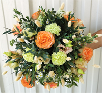 Photo for illustration purposes only | Bouquet rond de tonalité orange Bouquet rond de tonalité orange composé de fleurs de saison avec feuillage - Diamètre 40 cm