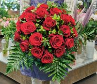 Photo for illustration purposes only | Bouquet rond de roses rouges Bouquet rond de roses rouges avec feuillage - Diamètre 40 cm