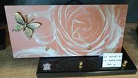Plaque granit (20x35cm) roses gravées peintes, cristaux Swarovski, et plaque en céramique (11x28cm) gravée or fin, sur socle (32.5x15cm) Possibilité de personnalisation par trois inters. Fabrication Vendéenne.