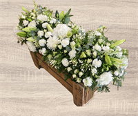 Fleurs fraîches. Dessus de cercueil avec des fleurs blanches. (Fleurs de saison, livré sans la caisse en bois)