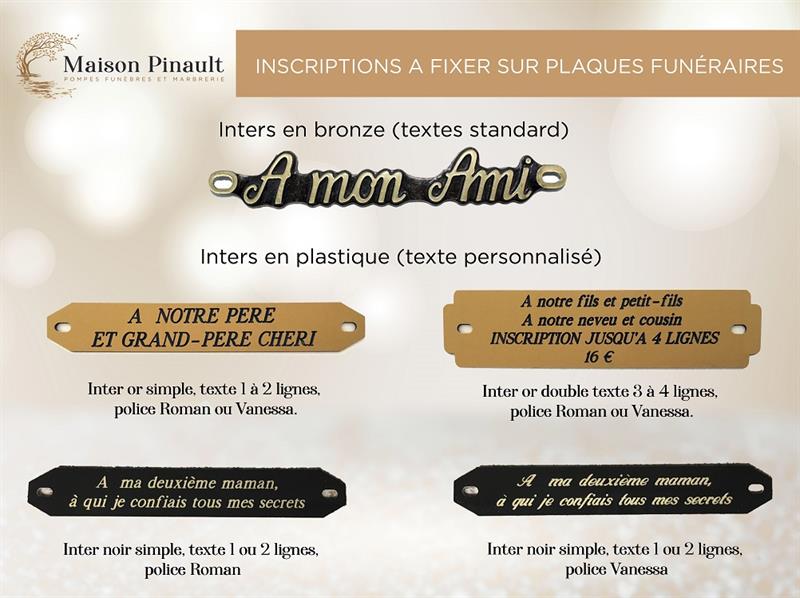 ATTENTION : PHOTO D'ILLUSTRATION, NE PAS COMMANDER CET ARTICLE. Présentation de nos différentes inscriptions. Textes standard sur inters en bronze ou textes personnalisés sur inters en plastique (couleur or ou noir, police Roman ou Vanessa). Si vous commandez une plaque funéraire, merci de nous appeler au 04 78 29 07 11 pour nous préciser le texte souhaité. ATTENTION : Nos articles en ligne sont exclusivement disponibles pour les funérailles que nous organisons. Aucun envoi par colis n'est proposé.