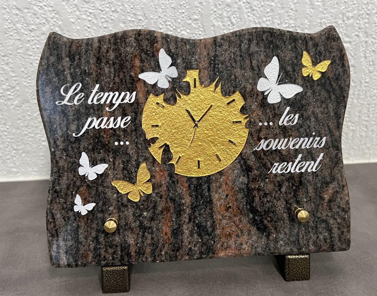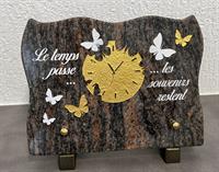 Plaque souvenir granit 20X17cm sur pieds avec un motif de pendule dorée, texte et papillons comprenant 1 inscription (inter en bronze). Merci de nous appeler au 04 78 29 07 11 pour nous préciser le texte souhaité. Attention : commande au plus tard le vendredi jusqu'à 18h pour les obsèques qui ont lieu le lundi. Nos articles en ligne sont exclusivement disponibles pour les funérailles que nous organisons. Aucun envoi par colis n'est proposé.