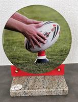 Plaque souvenir avec un socle en granit et motif de ballon de rugby en altuglas comprenant 1 inscription (inter en bronze). Dim : 19cm de large par 21cm de haut. Merci de nous appeler au 04 78 29 07 11 pour nous préciser le texte souhaité. Attention : commande au plus tard le vendredi jusqu'à 18h pour les obsèques qui ont lieu le lundi. Nos articles en ligne sont exclusivement disponibles pour les funérailles que nous organisons. Aucun envoi par colis n'est proposé.
