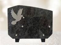 Plaque souvenir en granit sur pieds avec un motif d'une colombe en inox, dim : 21cmde large X 16,5cm de haut, comprenant 1 inscription (inter en bronze). Merci de nous appeler au 04 78 29 07 11 pour nous préciser le texte souhaité. Attention : commande au plus tard le vendredi jusqu'à 18h pour les obsèques qui ont lieu le lundi. Nos articles en ligne sont exclusivement disponibles pour les funérailles que nous organisons. Aucun envoi par colis n'est proposé.
