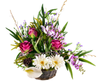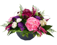 | Panier lavande Panier avec roses, glycines, callas, gerberas, succulents dans support lesté - Tonalités lavande, rose et blanc - Dimensions 49 x 27 et H 48 cm -