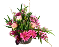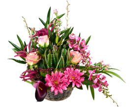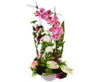 | Panier rose Panier avec roses, glycines, callas, gerberas, succulents dans support lesté - Tonalités de rose et fuchsia - Dimensions 49 x 27 et H 48 cm -