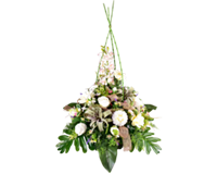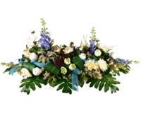 | Dessus de cercueil crème & lavande Dessus de cercueil avec roses, delphiniums, tillandsias - Dimensions : 149 x 66 cm - Tonalités de crème & lavande - Possibilité de rajouter option ruban (texte à préciser lors de la commande) -