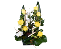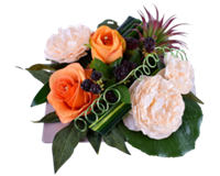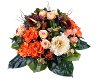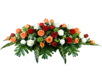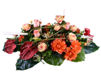 | Dessus de cercueil coloré Dessus de cercueil avec roses et boutons sursupport lesté - Longueur : env. 150 cm - Tonalité Orange Crème & Rouge - Possibilité de rajouter option ruban (texte à préciser lors de la commande) -