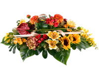 | Raquette colorée Raquette avec tournesol, anémones, roses, dahlias, hortensias, pandanus, osier blanc et fil de laiton sur support lesté - Dimensions : 106 x 59 cm - Tonalités de jaune et orange - Possibilité de rajouter option ruban (texte à préciser lors de la commande) -