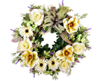 | Couronne crème Couronne de roses, magnolias, gerberas, lavandes, tillandsies et gypsophile sur support lesté - Diamètre env. 50 cm - Tonalité crème - Possibilité de rajouter option ruban (texte à préciser lors de la commande) -