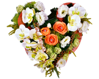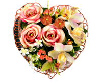 | Cœur ultraplat saumon Cœur ultraplat lesté avec roses, cymbidiums, statices - Coloris saumon - Dimensions 26 x 25 cm et H 13 cm -