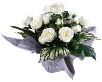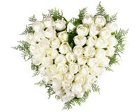 | Cœur de roses blanches Cœur de roses et boutons avec feuilles d'asparagus dans support lesté - Tonalité crème et verte - Dimensions : 52 x 52 cm - Possibilité de rajouter option ruban (texte à préciser lors de la commande) -