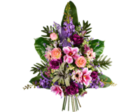 | Dessus de cercueil pastel Dessus de cercueil avec dahlias, roses, orchidées, hortensias, glycines & gerberas sur support lesté - Dimensions : 154 x 64 cm - Tomalités de lavande, blanc & rose - Possibilité de rajouter option ruban (texte à préciser lors de la commande) -