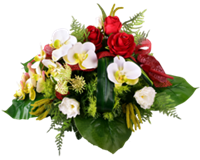 | Devant de tombe rouge Devant de tombe avec roses, orchidées, statices et pivoines dans support lesté - Tonalité rouge - Dimensions L 83 x l 42 x H 83 cm - Possibilité de rajouter option ruban (texte à préciser lors de la commande) -