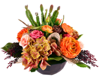| Coupe orange Coupe avec dahlias, renoncules, hortensias et gardénias dans support lesté - Tonalité orange - Dimensions 35 x 33 cm -
