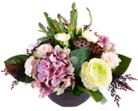 | Bouquet bulle pastel Bouquet bulle avec magnolias, hortensias et boutons de rose dans support lesté - Tonalité rose - Diamètre env. 45 cm -