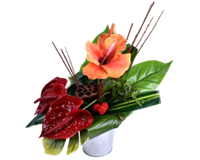 | Composition dans pot en zinc Composition multicolore avec hibiscus et anthurium dans pot en zinc lesté - Dimensions 38 x 23 cm et H 39 cm