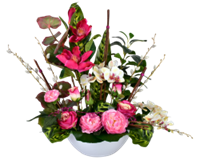 | Jardinière rose Jardinière avec roses et boutons, lys, cymbidiums et gardénia dans support lesté - Couleur rose - Dimensions 60 x 29 cm et H 56 cm -