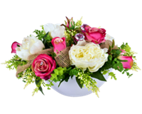 | Jardinière crème Jardinière avec oblondes, pivoines, roses et eucalyptus dans contenant lesté - Couleur crème - Dimensions 51 x 31 cm -