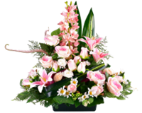 | Devant de tombe rose Devant de tombe avec roses et boutons, lys, delphiniums, cymbidiums et dahlia - Tonalité rose - Dimensions L 69 x l 38 x H 63 cm - Possibilité de rajouter option ruban (texte à préciser lors de la commande) -