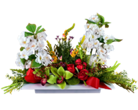 | Jardinière rouge Jardinière avec phaléno touch, roses, callas, magnolias,succulents et baies dans contenant lesté - Tonalité rouge - Dimensions 66 x 26 cm et H 58 cm -