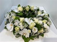 Krans met orchideeën, rozen, lysianthus, gypsophila, salal, eucalyptus. Doorsnede: 40 cm. *Snijbloemen worden aangepast per seizoen. Bloemen kunnen dus afwijken.