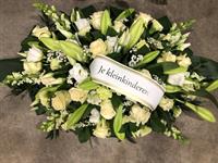 Rouwbloemstuk met rozen, lelies, lysianthus, leeuwenbek, groene anjers, gypsophila. Lengst: 60 à 70 cm. *Snijbloemen worden aangepast per seizoen. Bloemen kunnen dus afwijken.