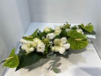 Rouwbloemstuk met orchideeën, rozen, lysianthus, groene anthurium, green trick, eucalyptus. Lengte: 75 cm. *Snijbloemen worden aangepast per seizoen. Bloemen kunnen dus afwijken.